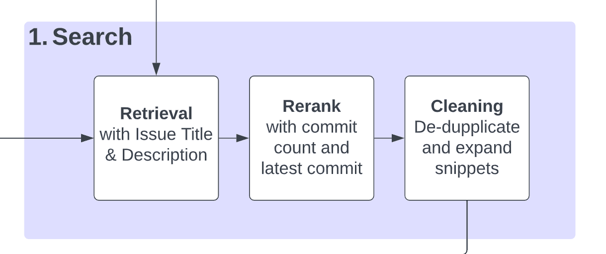 - Re-rank the snippets using a heuristic based on the commit count and time of the latest commit and pick the top 4. The assumption is that the files with the latest commit and highest commit counts are more likely to be edited again. We also at this point add any files mentioned directly.