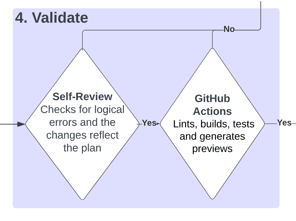 We run both an LLM-based and procedural validation to ensure that there are no errors in the new code and that the generated code reflects the changes summarized by the pull request.